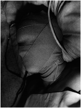 Soft Coffin (The Small Death) shows Marko, dramatically altered from how I know him in daily life as a solid six-foot mix of Nordic and Balkan bloods, a shaved scalp surmounted by a cap of the kind Jughead wears in the Archie comics. He appears, instead, as if in the grip of a sexual trance, laid out like a Goth leather-boy on the bier of his debaucheries, with a few toy skulls to keep him company. In Smudge (How to Write at the End of the Century), I see Gus, a writer and editor, against a backstack of books, leaning his head out of a deep shadow that has also invaded his eye sockets. He is presented, as a character, whose features are scrawled over with words applied in eyeliner, and three of his fingers rest on a manual typewriter from a time long ago. In Summer Heat (A Moment of Sadness), I recognize Nadia. She who usually radiates shapely health and stands elevated on trendy thick-soled shoes, here reclines in a bath of humid contemplation, head tilted forward over a breast covered with gauze. And then there's Katherine, whose taste is for svelte black fashions, but in Number Virus (Red Zone Measurements) may be seen in serene repose amidst light-coloured tulle. Her persona is unconscious of the digits dotting her skin, symptoms, as one would guess from the soundtrack, of a repressed wish to parade her measurements and play the role of a conquering whore.