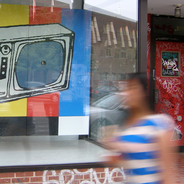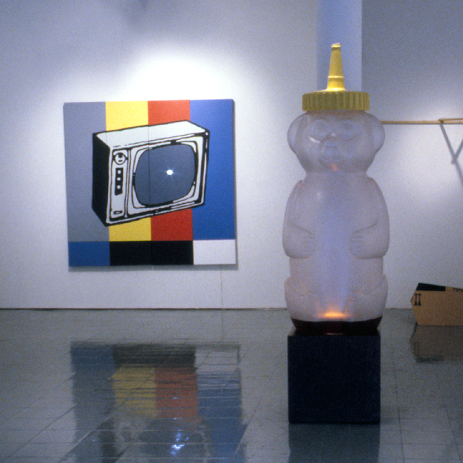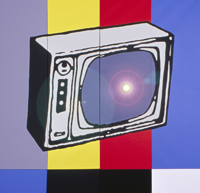 dimensions: 72"W x 71"HA multi-canvas painting that has been assembled into a single large unit; the centre of the tv screen image has a plastic-rimmed hole embedded in it that constantly emits a strobing light flash. It pulses like a television does, is completely difficult to stare directly at, & gets in the viewer's head as the colours flash on to the retina.