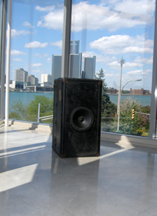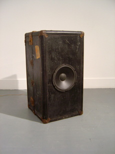 medium: travel case, mid-range speaker, electronic components, soundscape