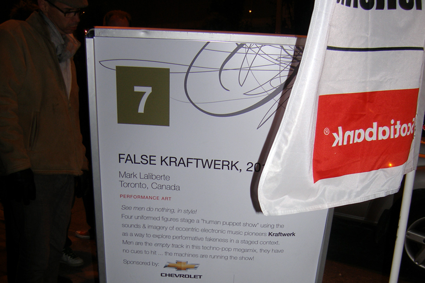 False Kraftwerk is a multi-layered experiment in a kind of 'performative fakeness' that is not modeled after a karaoke experience or lip-synch stances. This work examines common opinions about the legitimacy of electronic music performance as a live art, while simultaneously exploring the oversimplified 'pop' body in relation to technology, sound and vision.