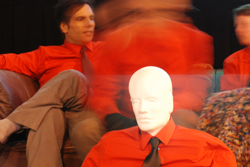 Four uniformed figures, visually unified in red shirt and black tie, enact a human puppet show using the sounds and imagery of eccentric electronic music pioneers Kraftwerk as a base. While Kraftwerk music plays throughout the evening and a fast-moving reversed video mashup of the seminal group performing are used as a seductive projected backdrop, the actual performers occupying the stage are left with little to do. The live men are the 'empty track' in this techno-pop megamix; they have no cues to hit since the machines are ultimately running the show. Emphasizing bored stances, they are reduced to showroom dummies trapped in front of their audience, passing the time by reading a book, checking their email or chatting with one another.