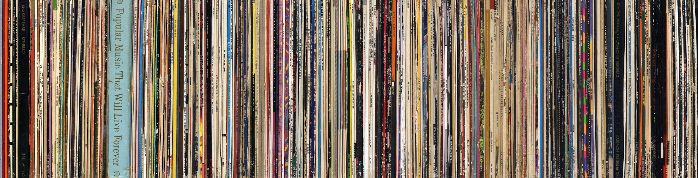 print dimensions: 13" H x 51" W @ 300 dpi / 173 MB... this digital photo-work, which comprises a horizontal scan of my entire 12" vinyl record collection, has been created as a unique page work to be printed as a 5-page sequence (beginning on a right face) with bleeds. It was made using a flatbed scanner as my "camera".